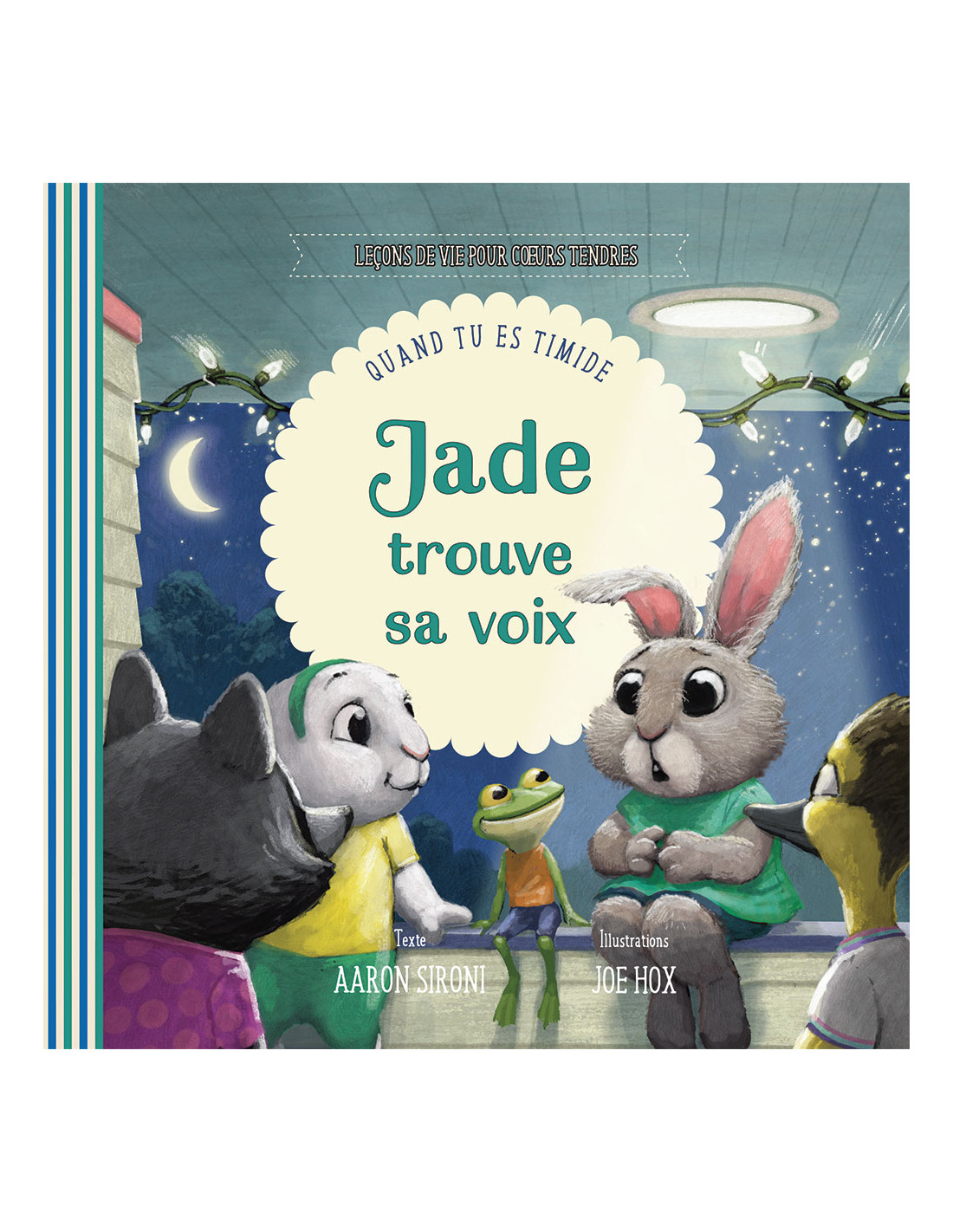Jade devrait sauter de joie à lidée de passer la nuit chez sa cousine Évie. Pourtant, elle est très inquiète. Et si les amis dÉvie ne sintéressaient pas à elle ? Et si elle ne savait pas quoi dire ? Mais après la rencontre inattendue dune effrayante professeure de piano, Jade, armée des paroles du Grand Livre, découvre que Jésus peut lencourager même quand elle est très intimidée. Comme dans les autres livres de la collection « Leçons de vie pour coeurs tendres », en plus du récit, les parents, grands-parents et tous ceux qui sont au contact denfants trouveront des conseils utiles pour apporter une aide concrète, basée sur la grâce, à tous les enfants qui se sentent timides.