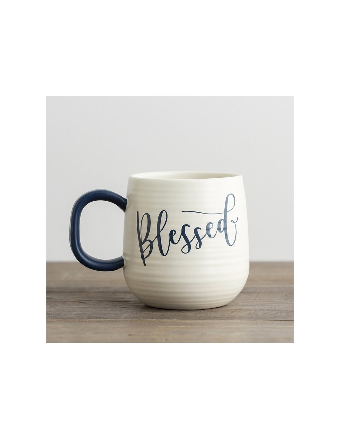 Artisan mug in white with indigo lettering and handle Flowing script on one side of the mug reverse side , scripture quote: