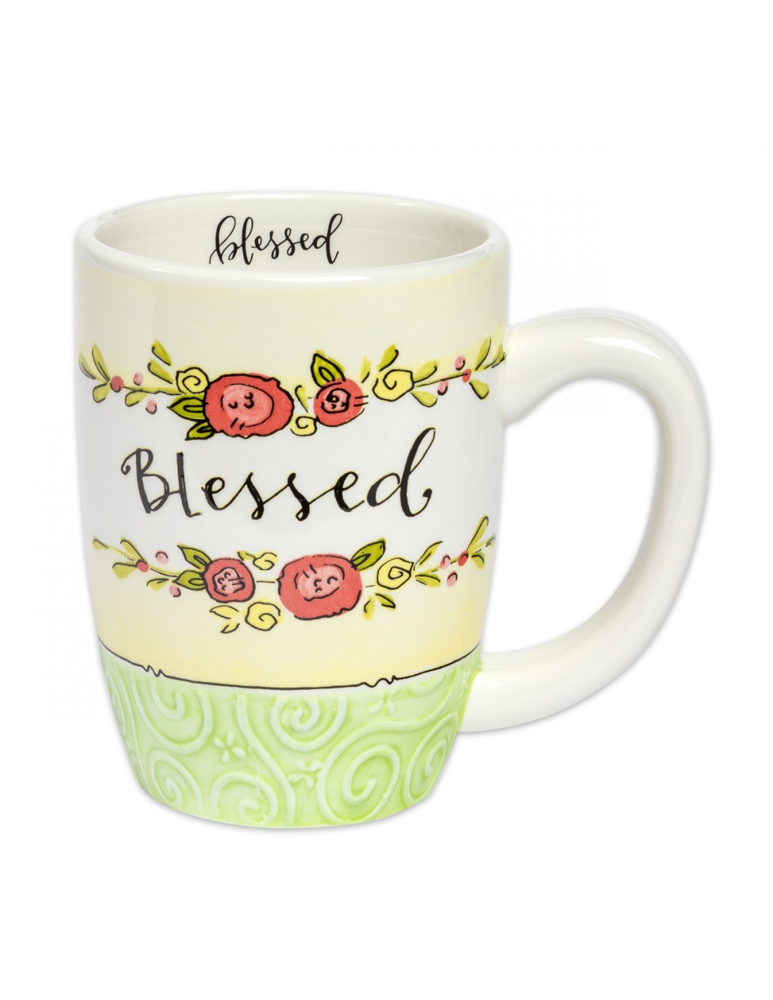 embossed floral band. Each mug features a simple, inspirational message on each side as well as a