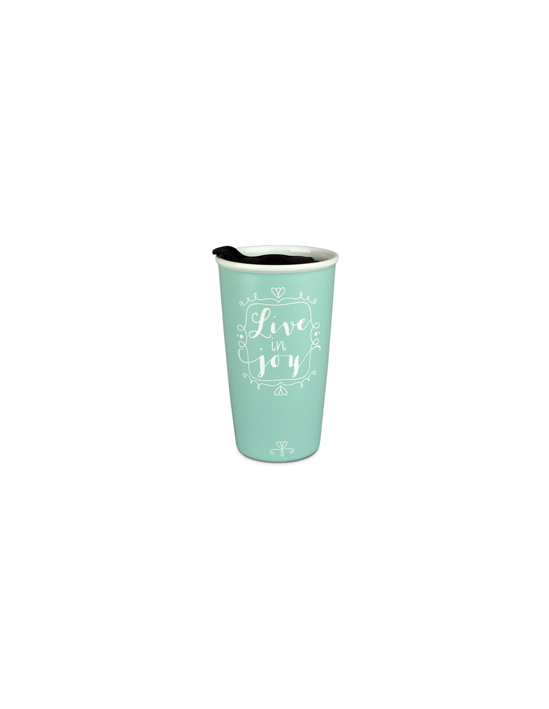 Travel mug designed with teal exterior and white interior featuring swirl design with encouraging message and Scripture verse. Double wall ceramic tumbler with plastic lid; 12 ounce capacity; BPA free; microwave and dishwasher safe; boxed.