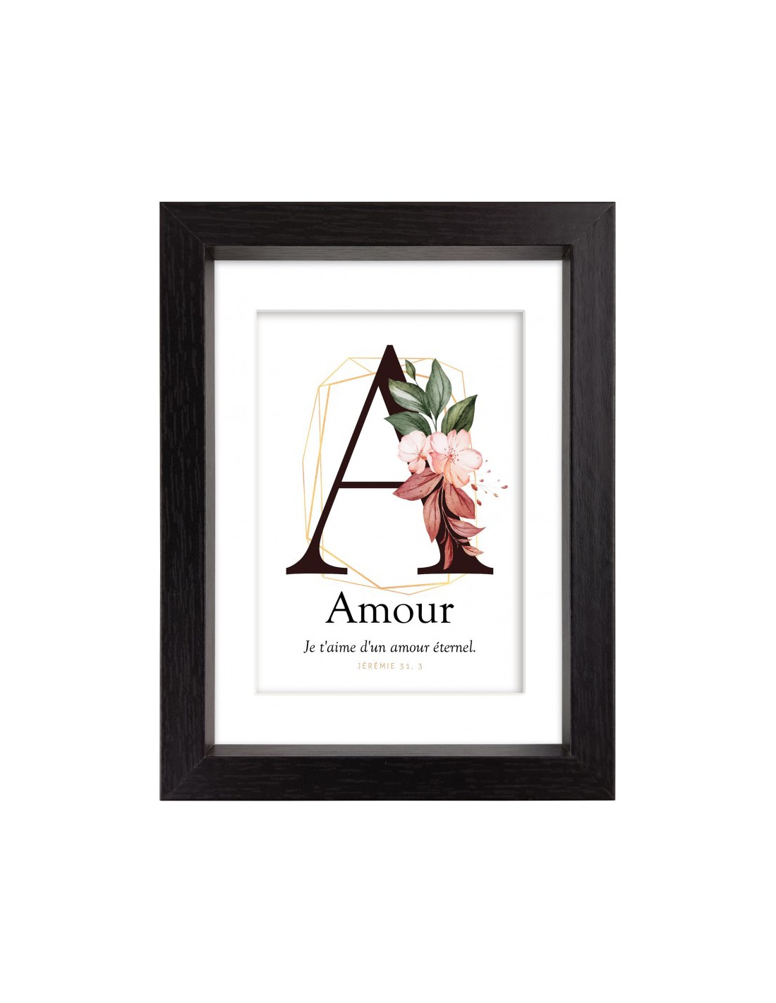 Joli cadre déco noir lettrine "A" comme Amour et le verset : "Je t'aime d'un amour éternel." (Jérémie 31,3)