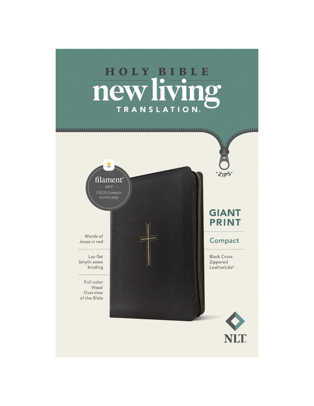The Bible Reading Experience: Reimagined! Like other compact editions of the New Living Translation, this handy Bible fits easily into a purse, backpack, briefcase, or suitcase. This Bible features the life-changing New Living Translation text in easy-to-read 10-point font with a zipper closure to keep pens, notes, and bookmarks inside. And for the same low price as similar text-only Bibles, the NLT Compact Giant Print Bible offers much more with the groundbreaking Filament Bible app. This app enables you to use your mobile phone or tablet to connect every page to a vast array of curated content, including study notes, audio Bibles, devotionals, interactive maps, informative videos, and inspiring worship music. The Filament Bible app turns this large print Bible into a powerful study and devotional experience, offering more to expand your mind and touch your heart than you can possibly hold in your hand. Special features of this NLT Bible include: Words of Jesus in red Generous 10-point font Full-color Visual Overview of the Bible Full access to the Filament Bible app Lay-flat Smyth-sewn binding Ribbon marker Presentation page This compact Bible makes a perfect gift for young adults, adults, seniors, and those who are looking for an easier reading experience at any age. Elevate Your Bible Study with the Filament App Absolutely Free! Unlock a world of knowledge and inspiration right at your fingertips! The Filament Bible app is your gateway to a deeper, more enriching Bible-study experience. Seamlessly connect every page of your Bible to a treasure trove of resources, including: 25,000+ study notes by more than 40 scholars offering a deeper understanding of what you re reading 350+ videos to captivate you as you unpack key information about the background and meaning of the Bible 40+ maps and infographics explaining the geography and cultural background of the Bible 400+ profiles and articles