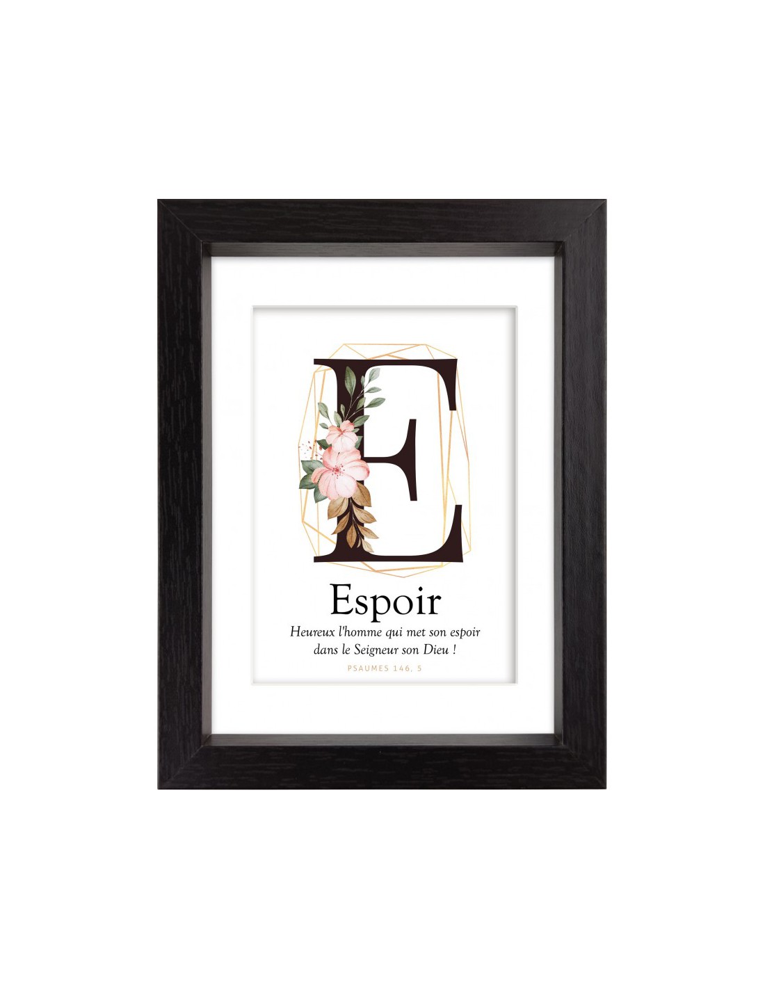 Joli cadre déco noir lettrine "E" comme Espoir et le verset : "Heureux l'homme qui met son espoir dans le Seigneur son Dieu. " (Psaumes 146 :5)