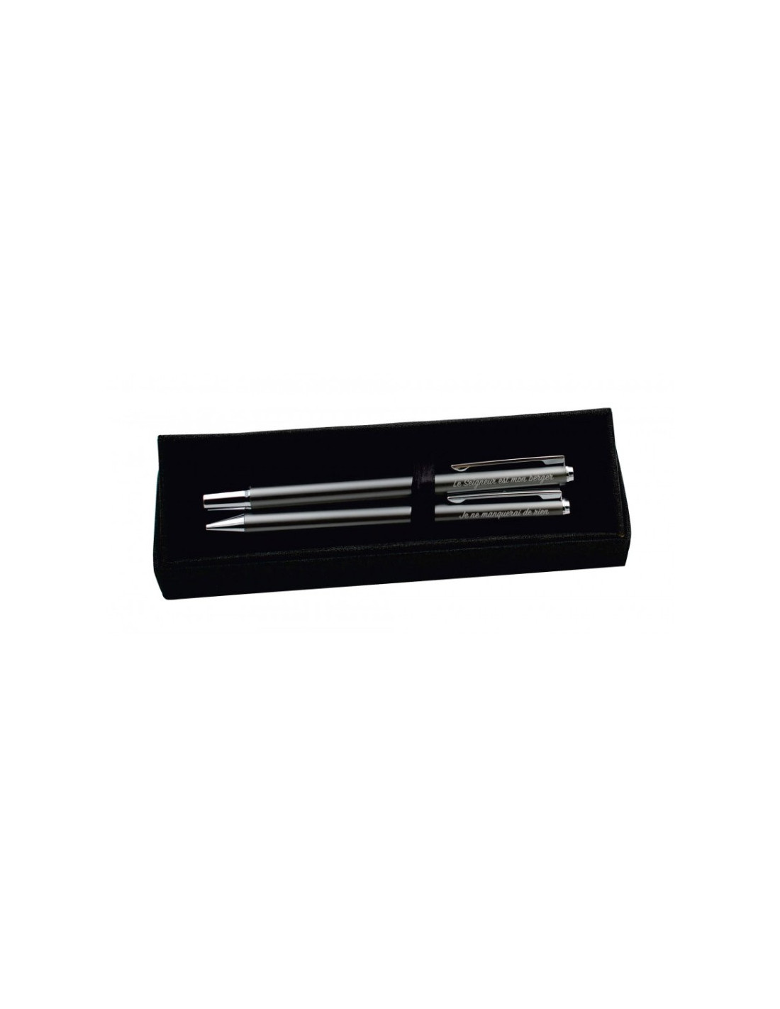 Set d'écriture en aluminium recyclé se composant d'un stylo à bille et d'un stylo roller. Ils sont ornés de deux gravures : « Le Seigneur est mon berger... », et « je ne manquerai de rien. » (Psaume 23.1)