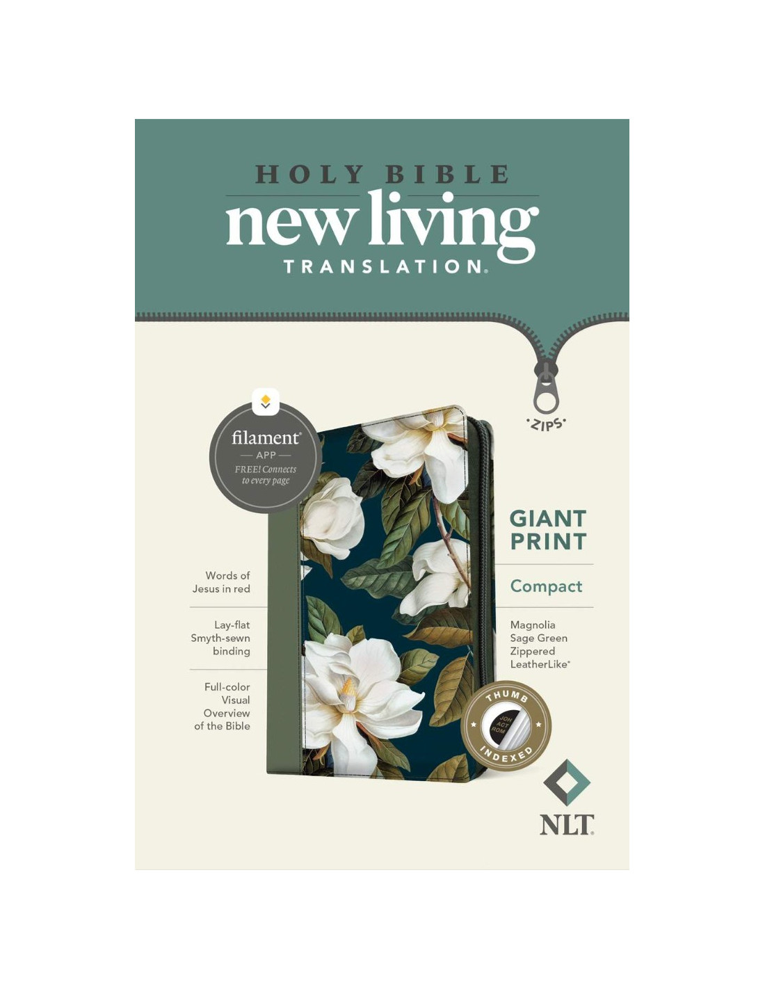 Tyndales innovative Filament-enabled Bible line is now available in the NLT Compact Giant Print edition. Like other compact editions of the New Living Translation, this Bible fits easily into a purse, backpack, briefcase, or suitcase. This Bible features the life-changing New Living Translation text in 10-point font with the words of Jesus in red, plus a presentation page and a full-color Visual Overview of the Bible. And for the same low price as similar text-only Bibles, the NLT Compact Giant Print Bible offers much more with the groundbreaking Filament Bible app. This app enables you to use your mobile phone or tablet to connect every page to a vast array of curated content, including thousands of study notes and hundreds of devotionals, plus interactive maps, informative videos, and inspiring worship music. The Filament Bible app turns this Bible into a powerful study and devotional experience, offering more to expand your mind and touch your heart than you can possibly hold in your hand. The New Living Translation is a clear and trusted English translation of the Bible. It conveys the precise meaning of the original languages in a flowing, effortless writing style that promotes comfortable and meaningful reading.