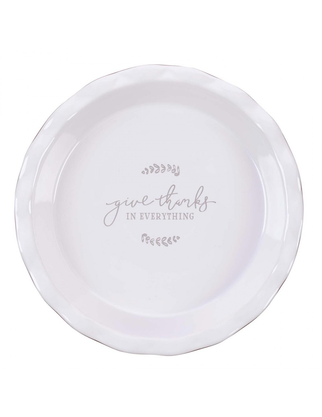 Show your grateful heart with the Give Thanks in Everything 9.5-inch Plate. "Give thanks in everything, is taken from 1 Thessalonians 5:18 and turns our hearts to focus on what we have, rather than we don't have. The 9.5-inch ceramic pie plate has fluted edges for creating beautifully scalloped pie crusts. A neutral taupe exterior and crisp white interior decorated with the simplistic design of thyme sprigs and the words "Give Thanks in Everything" make this an elegant piece for the table.