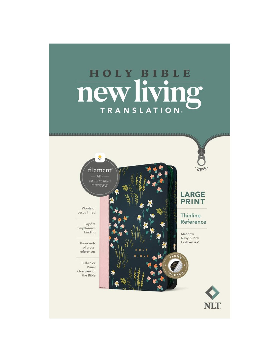 The Bible Reading Experience: Reimagined The new Tyndale classic NLT Large Print Thinline Reference Bible, Filament-Enabled Edition has readable text, an attractive layout, and cross-references in a thin, easy-to-carry size. And while it has the same low price as basic text-only Bibles, the NLT Large Print Thinline Reference offers much more. It not only features a bold new design and the trusted and much-loved New Living Translation (NLT) but also includes the groundbreaking Filament Bible app. This app enables you to use your mobile phone or tablet to connect every page to a vast array of related content, including study notes, devotionals, interactive maps, informative videos, and worship music. The Filament Bible app turns this Bible into a powerful study and devotional experience, offering more to expand your mind and touch your heart than you can possibly hold in your hand. And there is no additional cost for the Filament Bible app. No additional purchase. No additional size or weight. Of course, you can use this Bible without the app, but when you want to dig deeper, grab your phone or tablet and open the Filament Bible app. Its so easy to use. Features: New designs and Filament content for each page! Readable large print Handy thin size Words of Jesus in red Thousands of cross-references Quality lay-flat Smyth-sewn binding Tyndale Verse Finder Presentation page Ribbon marker Gilded page edges Filament Bible app with free access to: 25,000 study notes 350+ videos 40+ maps and infographics 400+ profiles and articles 1,500+ devotionals Library of worship music