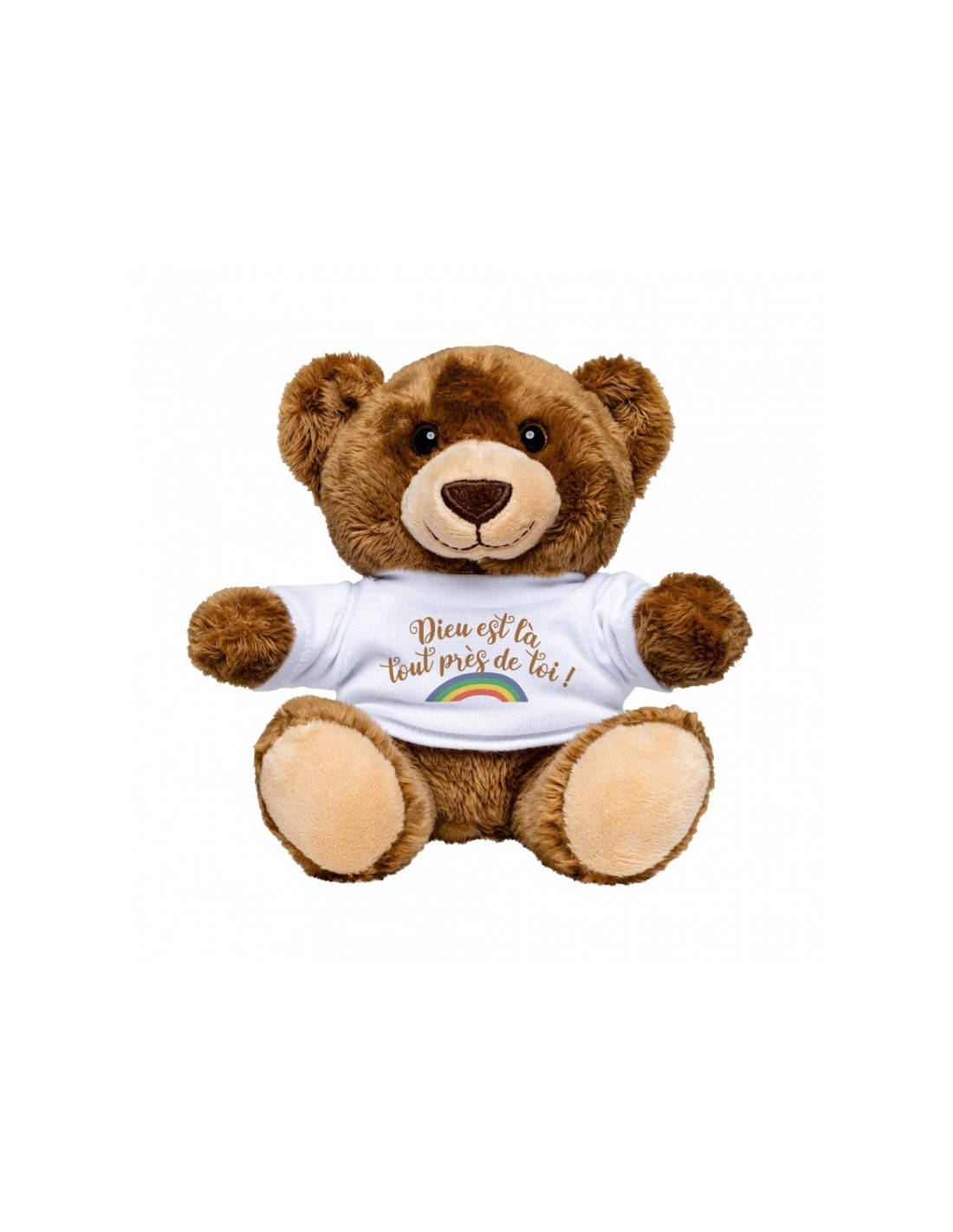 L'adorable ourson «Teddy», apporte un message plein de tendresse grâce à son tee-shirt blanc orné d'un design coloré et du texte : « Dieu est la, tout près de toi.» +/- 12.5x14 cm